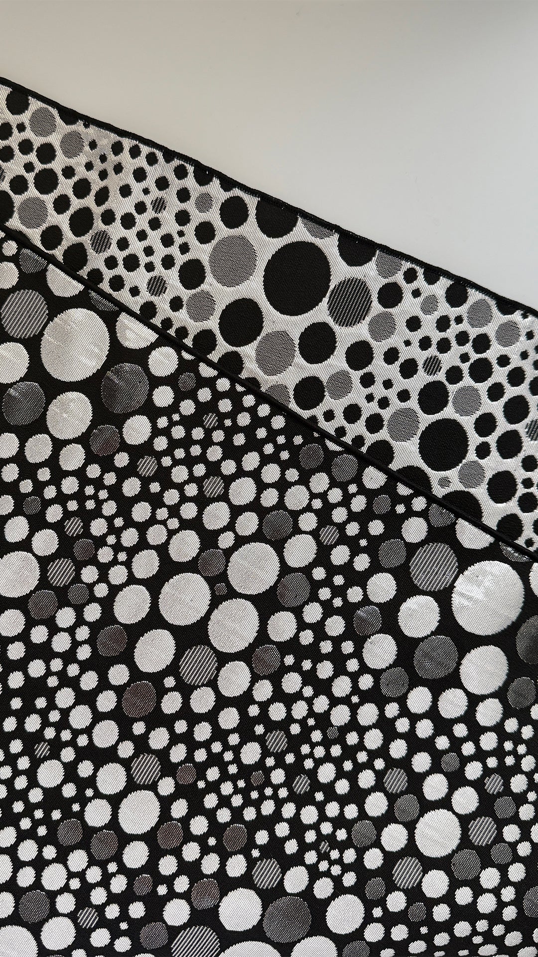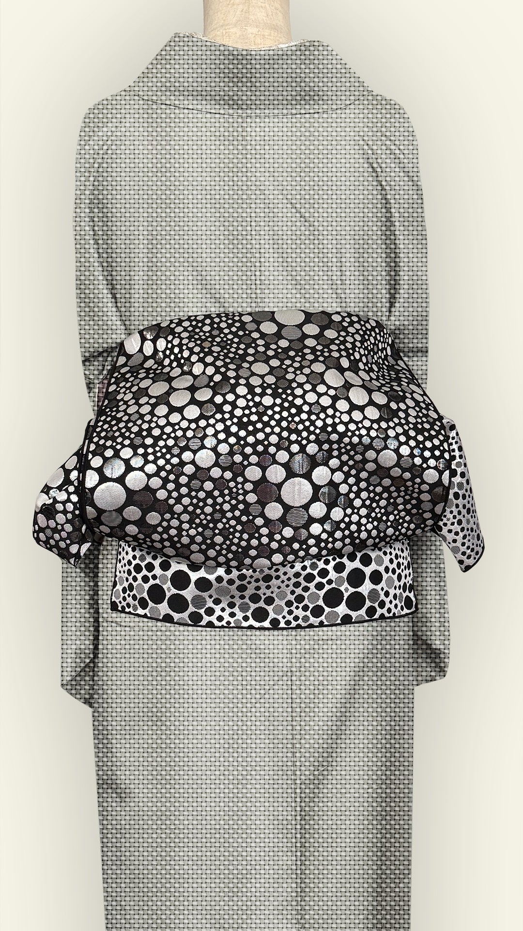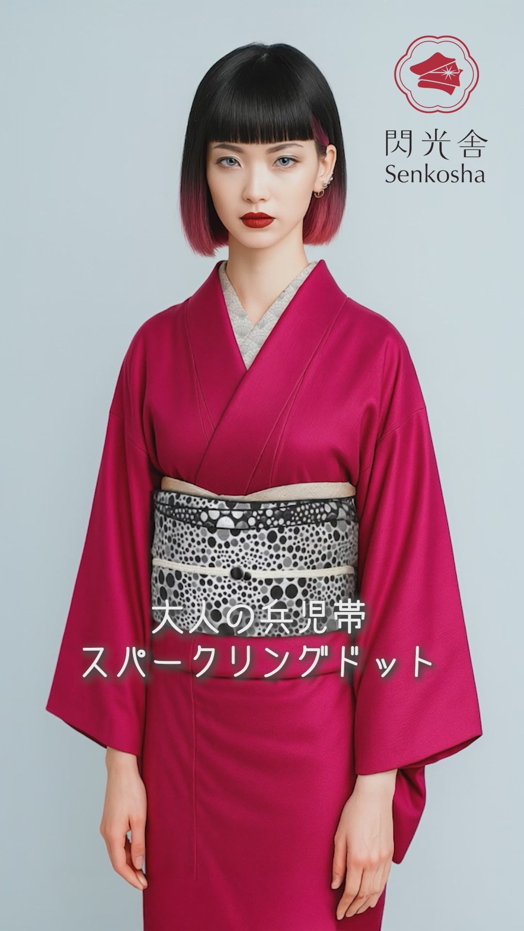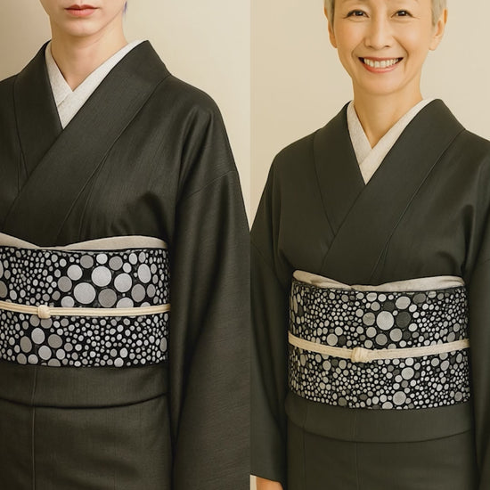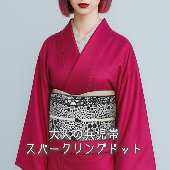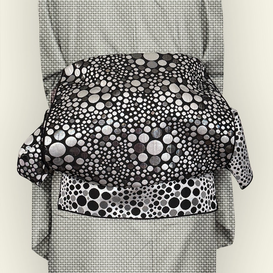 兵児帯 大人のへこ帯 リバーシブル ナイトスパークリング ドット 水玉 ブラック シルバー 【サイズ・素材】 素材 ポリエステル 巾 約 31cm 長さ 約 450cm 【着用シーン】 カジュアルな装いに。 紬、小紋、木綿、ウール、デニム、アンティーク着物、浴衣にも。 パーティーでの色無地、訪問着、振袖など。 【着用時期】 オールシーズン 【商品について】