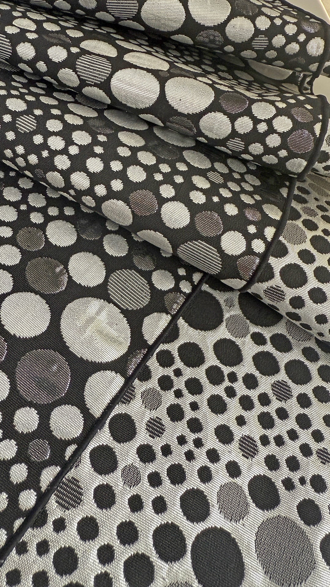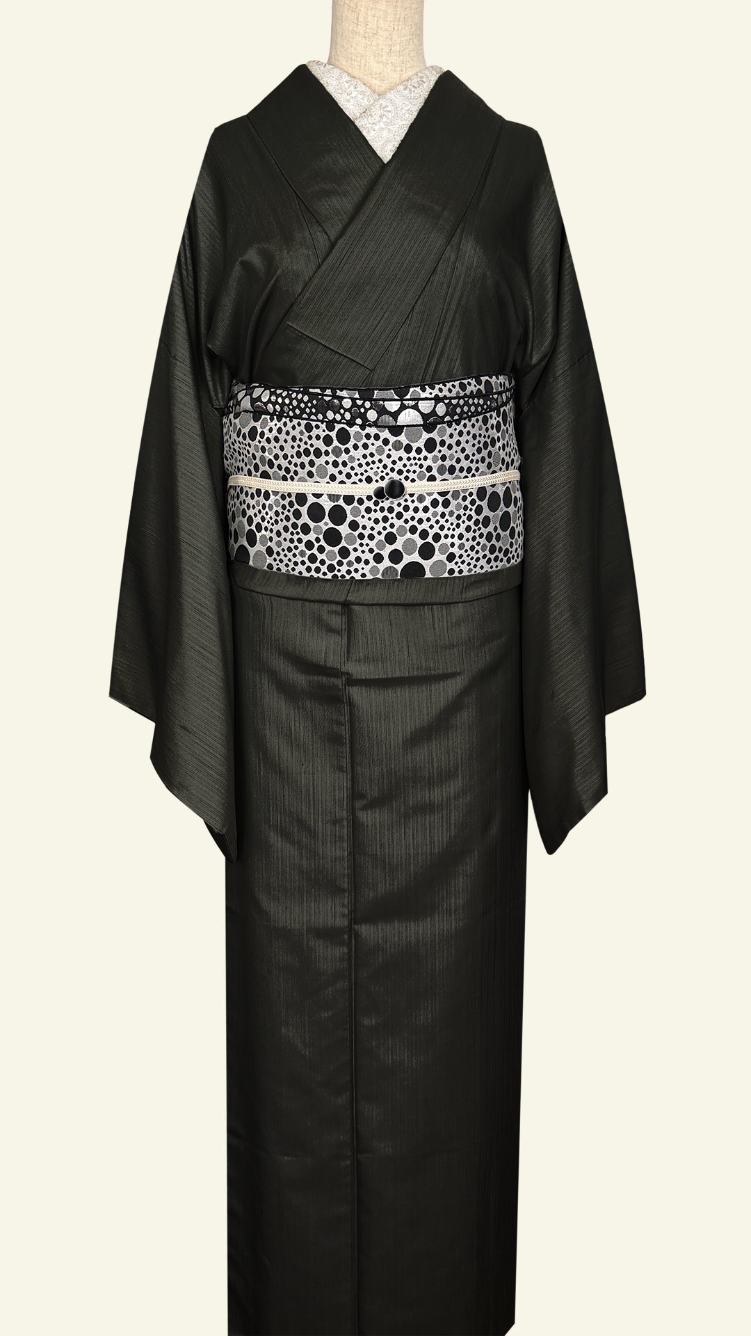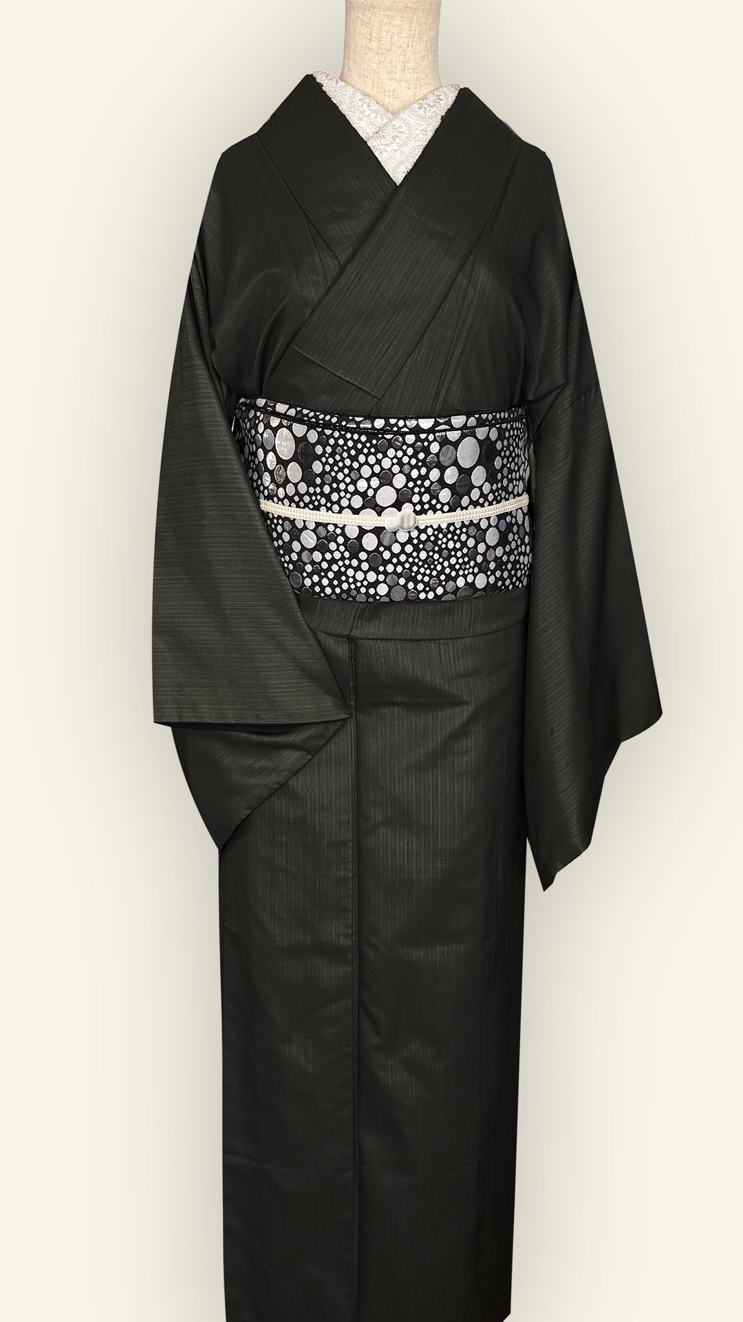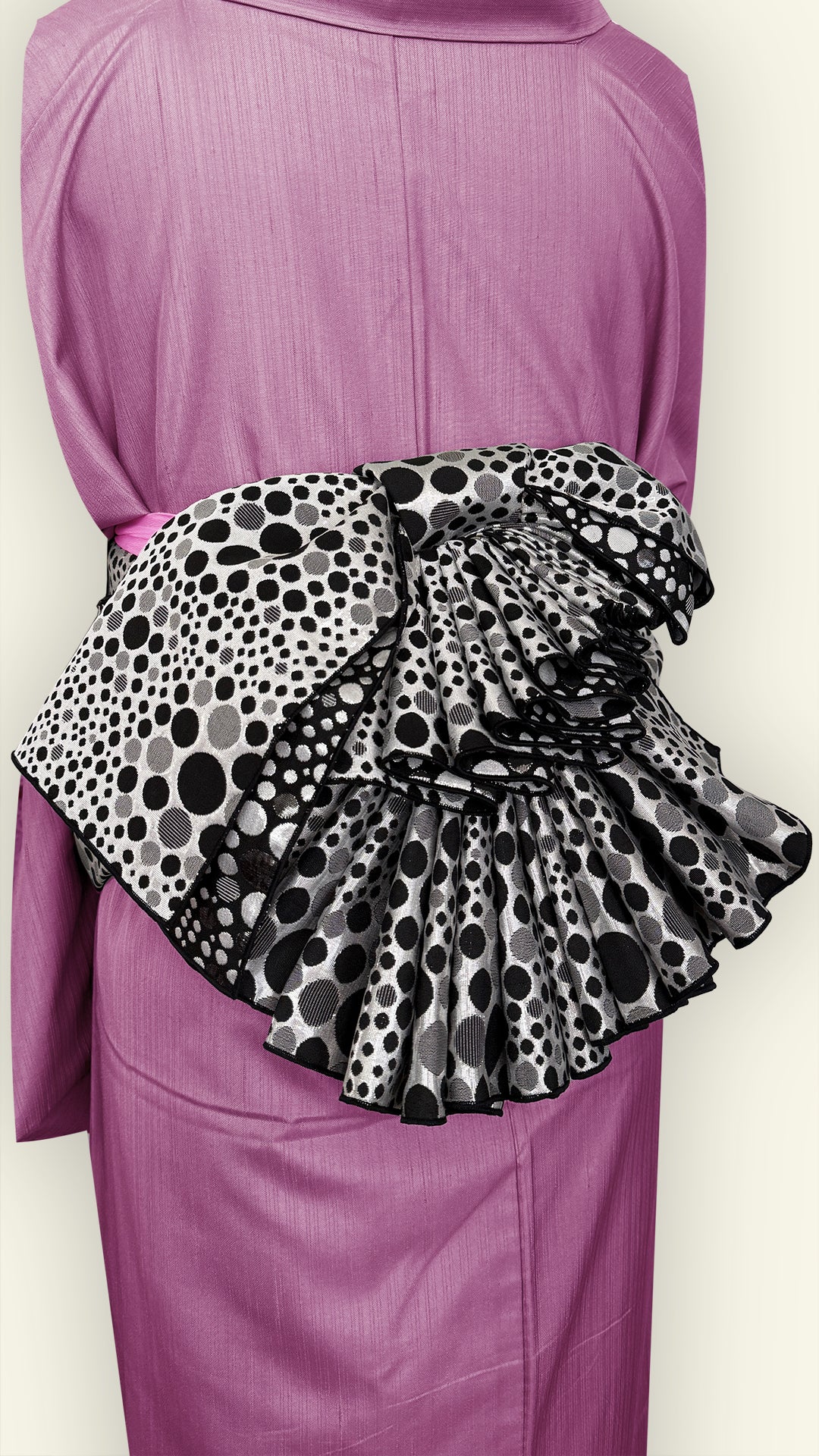兵児帯 大人のへこ帯 リバーシブル ナイトスパークリング ドット 水玉 ブラック シルバー 【サイズ・素材】 素材 ポリエステル 巾 約 31cm 長さ 約 450cm 【着用シーン】 カジュアルな装いに。 紬、小紋、木綿、ウール、デニム、アンティーク着物、浴衣にも。 パーティーでの色無地、訪問着、振袖など。 【着用時期】 オールシーズン 【商品について】