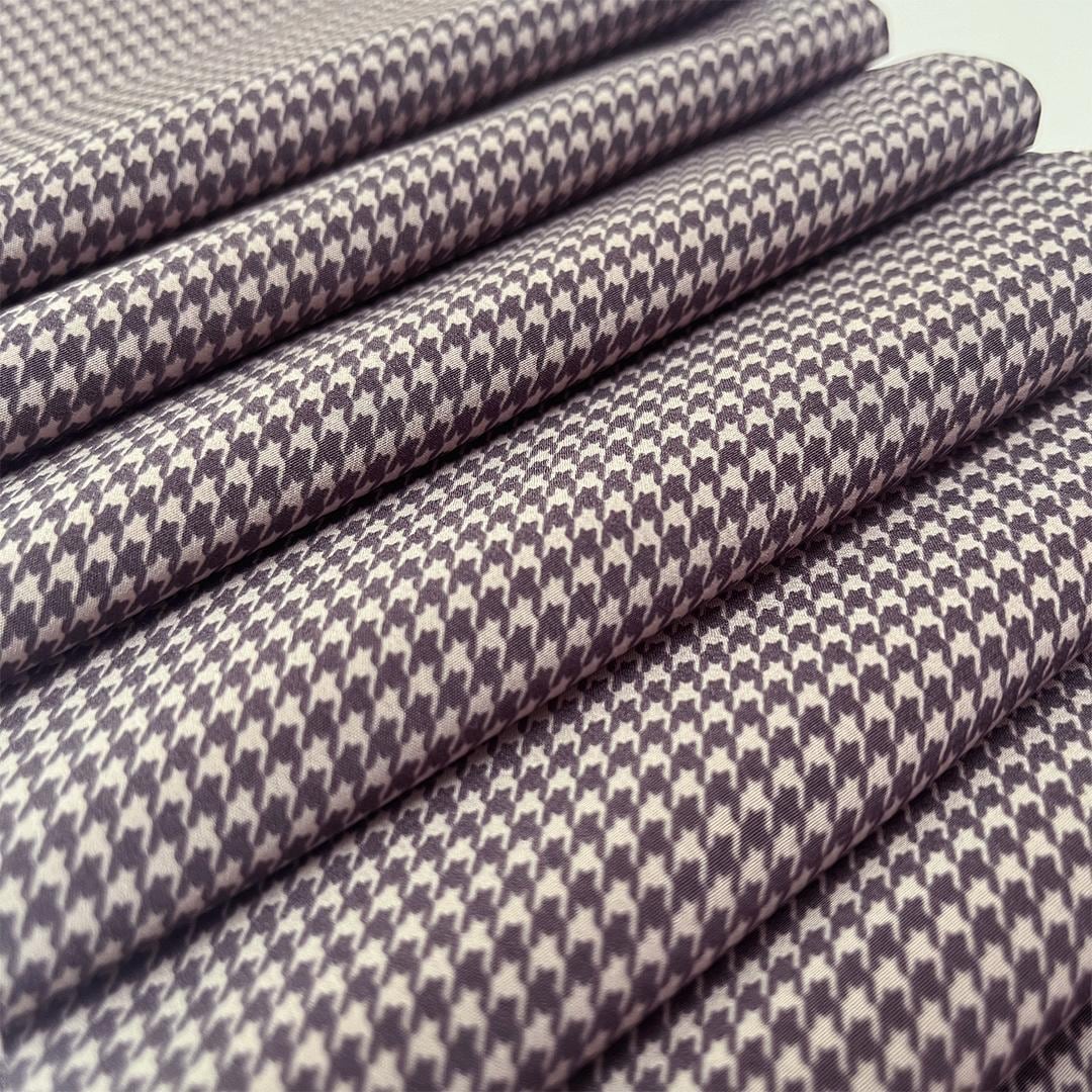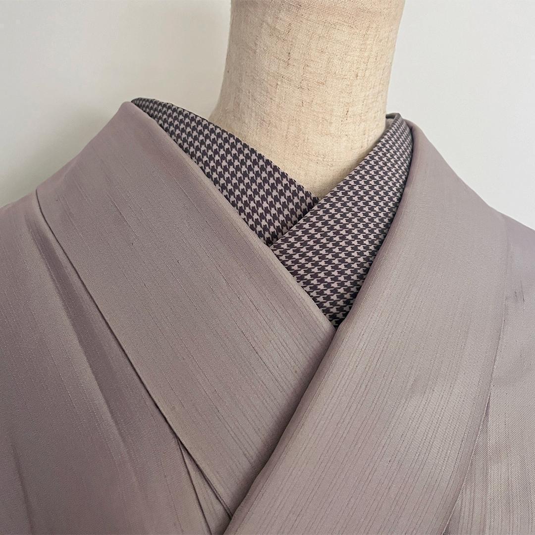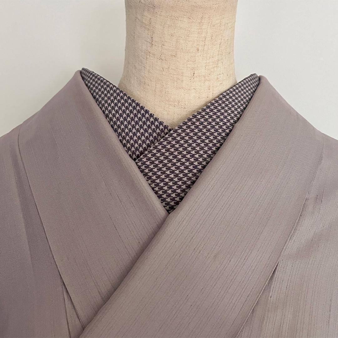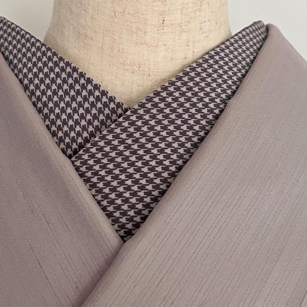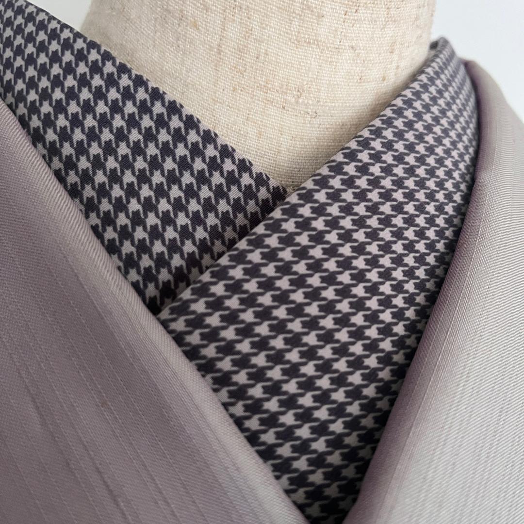 くすんだパープルの細かな千鳥格子柄で、無地感覚で使える合わせやすい衿だと思います。