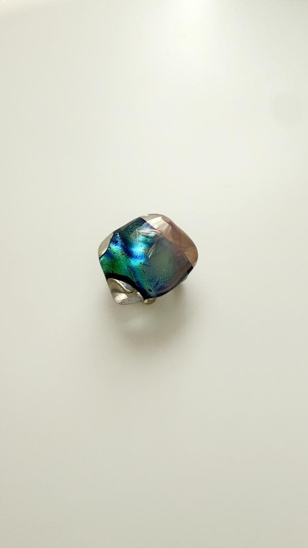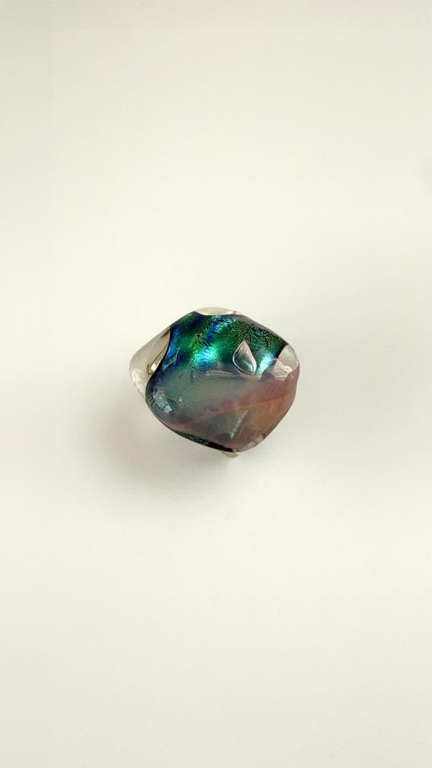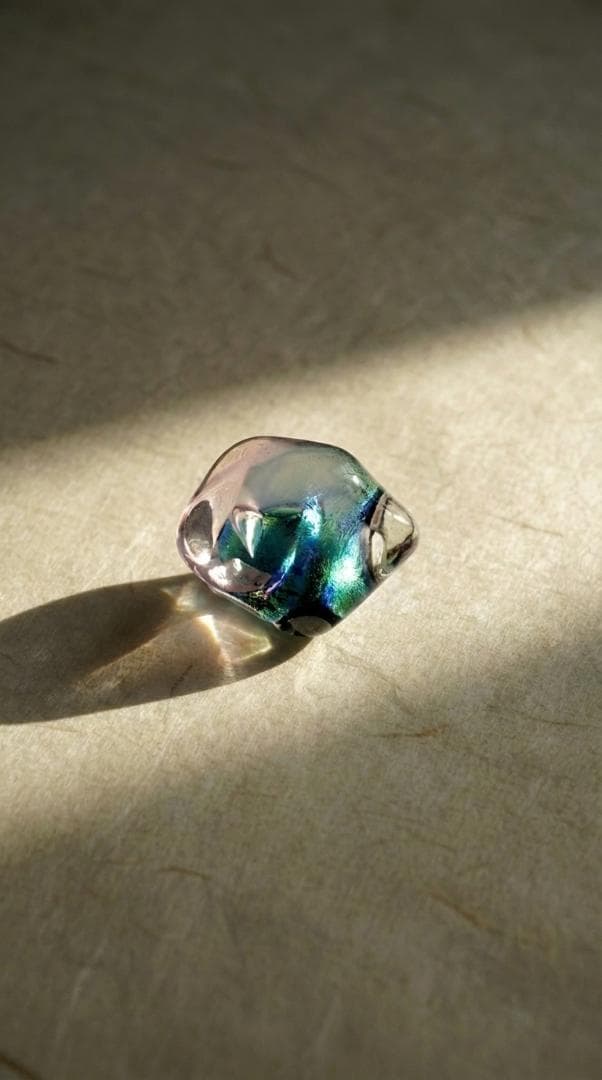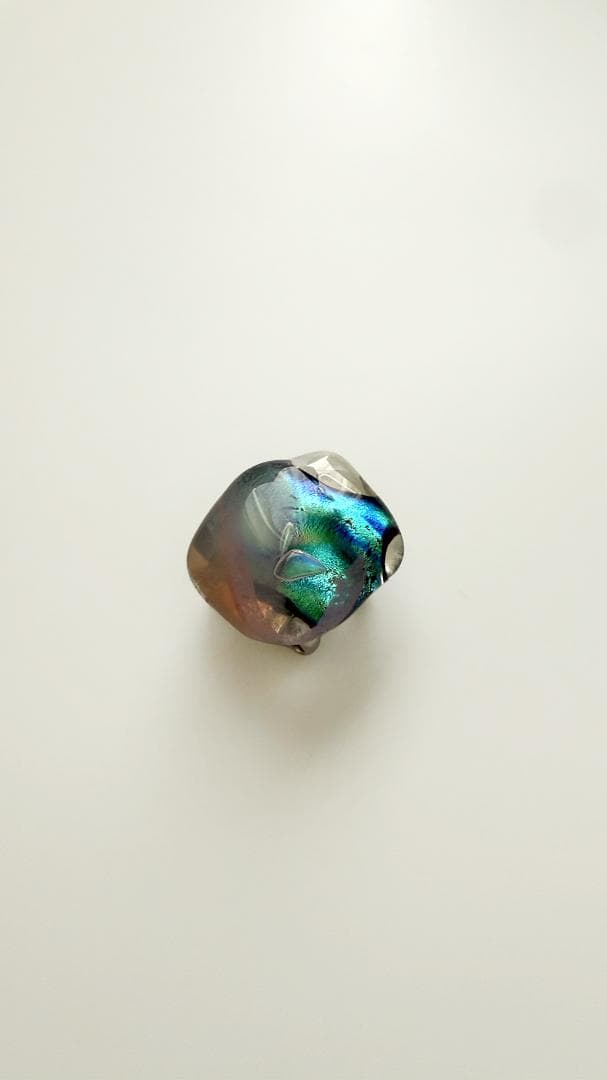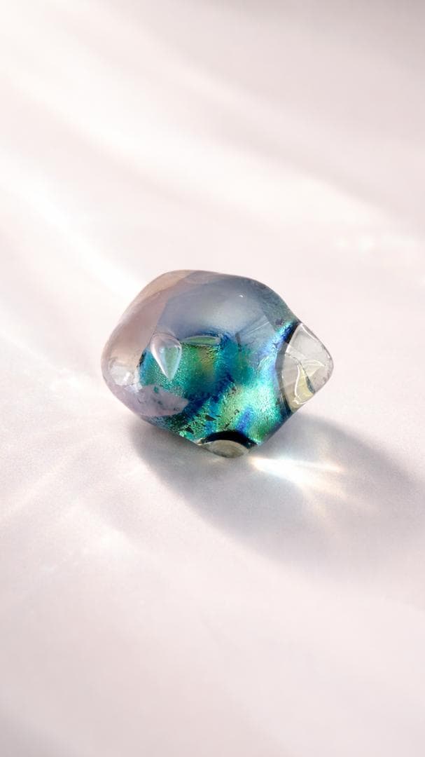 【商品名-2259】 ガラスの帯留め 碧 オーロラ 透明感 氷 雫 着物 2259 【サイズ・素材】 素材 ガラス 横 約 2.5cm 縦 約 2.2cm 帯留め金具(銀色 三分紐・四分紐が通ります。) 【商品について】 まるで氷の中に海を閉じ込めたような、透き通る輝きを放つ帯留めです。 光を透過するクリアなガラスの奥で、エメラルドグリーンからターコイズブルーへと移ろうダイクロの色彩。ほんのりとさすピンクも美しいです。 見る角度によって、また差し込む光の種類によって、その表情はオーロラのように揺らめきます。 カチッとしすぎない、とろけるような丸みを帯びたフォルムは、帯元に柔らかなニュアンスをプラスしてくれます。 陽射しの中でキラキラと輝く姿は、お出かけをより特別なものにしてくれるはず。 光を味方につけて、洗練された大人の着こなしをお楽しみください。 【着用シーン】 カジュアルからセミフォーマルな装いに。 紬、小紋、木綿、ウール、デニム、アンティーク着物、 パーティーでの色無地、付下げ、訪問着、振袖、成人式の前撮りなどにも。 【着用時期】 オールシーズン