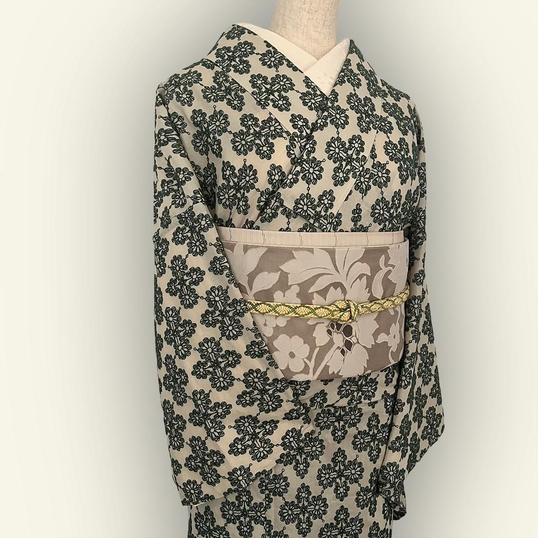 着物 単衣 花菱の刺繍 緑 コットン きもの コットンレース 木綿 グリーン
