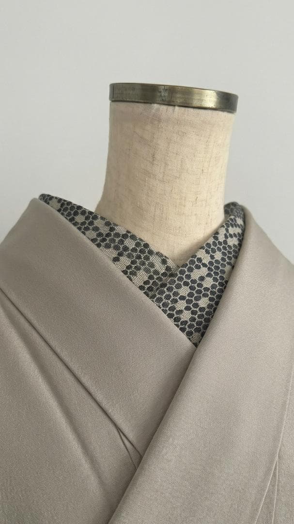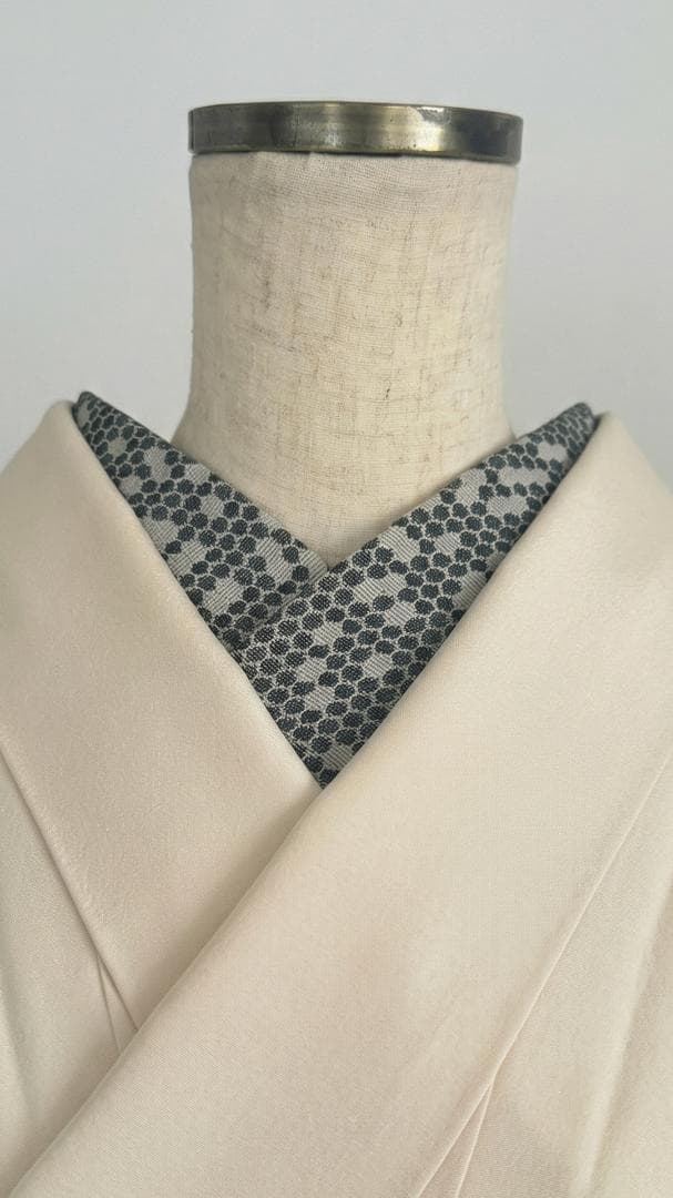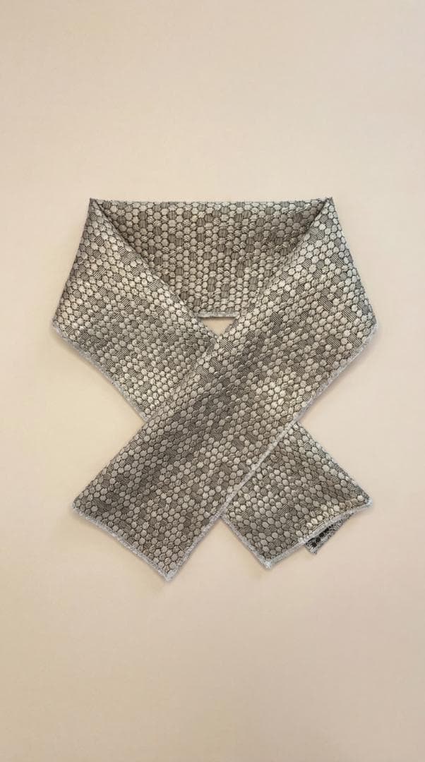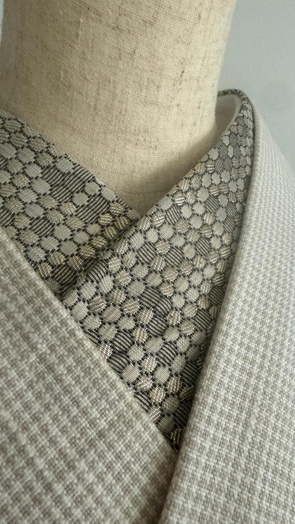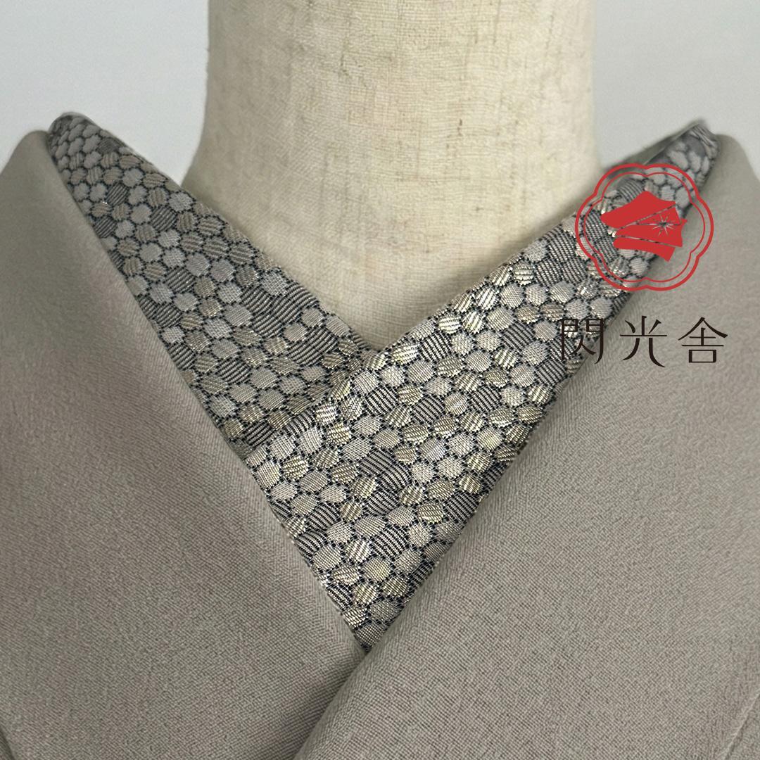 【商品名-2256】 半衿 【ビーハイブ アンティークブラス】 金古美 ハニカム 紋織り モダン ユニセックス リバーシブル 【サイズ・素材】 素材 ポリエステル / レーヨン / ラメ糸(純銀使用) 巾 約 15cm 長さ 約 95cm 【お値引きについて】 複数のご購入で二枚目から200円づつお値引きいたします。 (単品でのお値引きはごめんなさい!) おまとめ希望の際はご購入前にコメントお願いいたします。 ↓出品中の半衿検索 #閃光舎_半衿 #閃光舎 【ご購入の前にプロフィールの閲覧をお願いいたします】 【着用シーン】 カジュアル~セミフォーマルな装いに。 紬、小紋、木綿、ウール、デニム、アンティーク着物、 パーティーでの色無地、訪問着、付下げ、振袖、成人式の前撮りなどにも。 【着用時期】 9月~5月 袷の時期に 【お手入れ】 ご自宅でのお手入れが可能です。 やさしく手洗いしてあげてください。 【商品について】 整然と並ぶ「蜂の巣(ハニカム)」模様を、純銀を使った光沢糸で織り上げました。光の角度で幾何学模様が浮き立つ、奥行きのある表情が魅力です。 「可愛い」モチーフを、クールでハイエンドな質感に落とし込んだ、大人のためのモダンな一枚です。 訪問着や付け下げなどのセミフォーマル〜軽めの礼装(パーティーシーン等)にも、格式張りすぎない抜け感を作れます。(吉祥柄の亀甲柄ですしね!) もちろん、紬や小紋に合わせて、モードな輝きをプラスするのもおすすめです。 裏面は織りの組織が反転し、また異なるマットな表情を見せます。 その日の着物や帯の質感に合わせて使い分けられる、実用的な2way仕様です。 全4色、他のお色もぜひご覧ください。 ※正確なお色を画像でお伝えするのが難しいです。 厳密な色合いを求める方はご遠慮ください。 ※着用のイメージとして、一部AIによる生成画像を掲載しています。 お買い物のヒントにどうぞ。