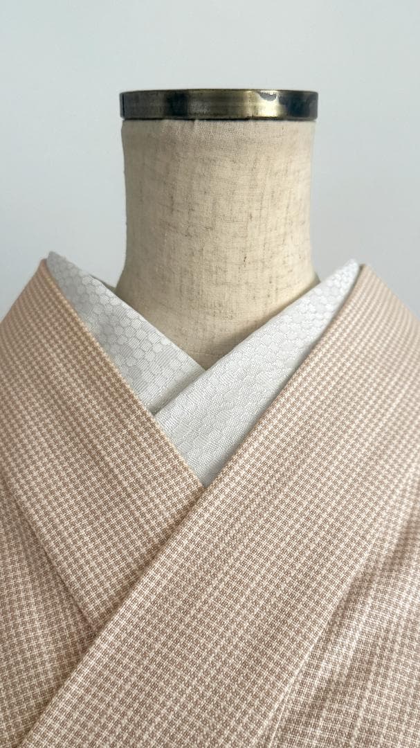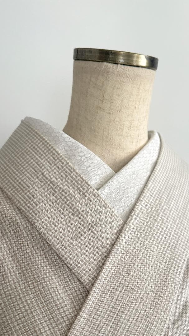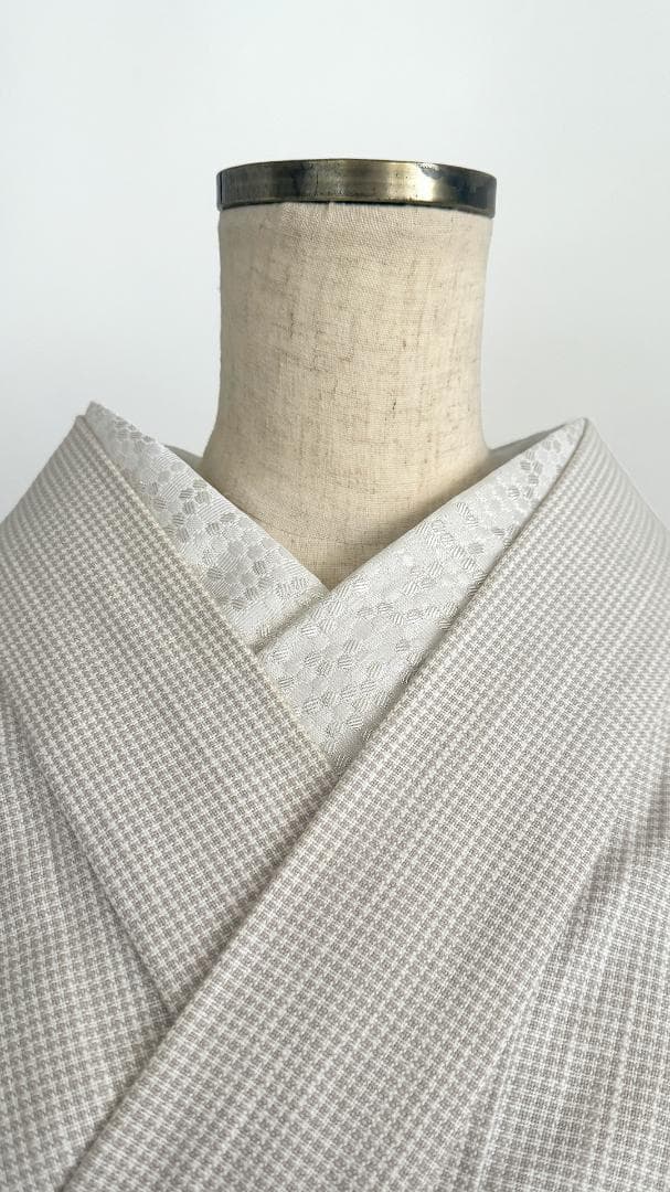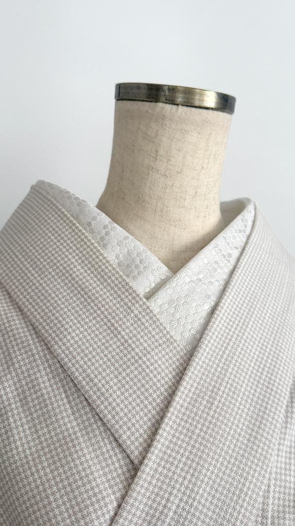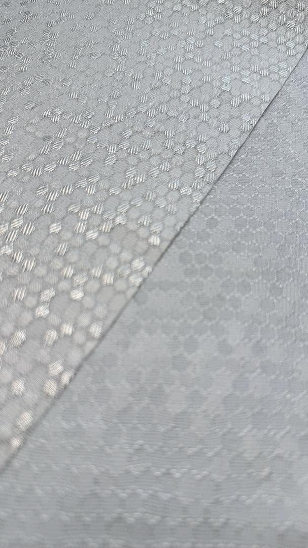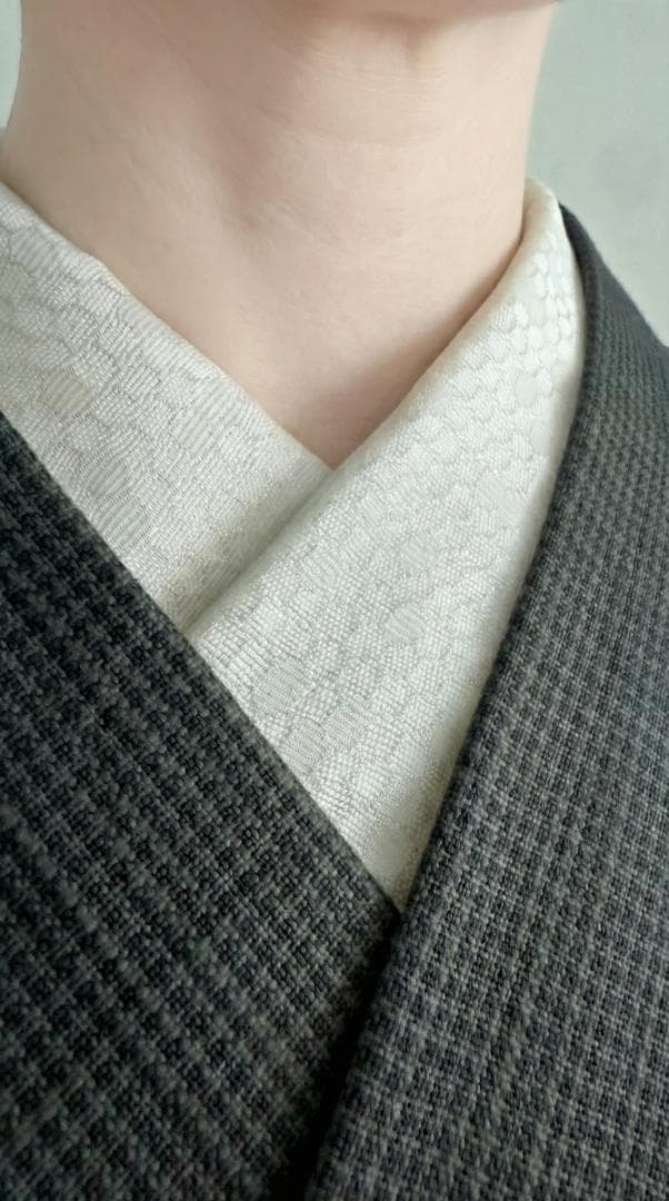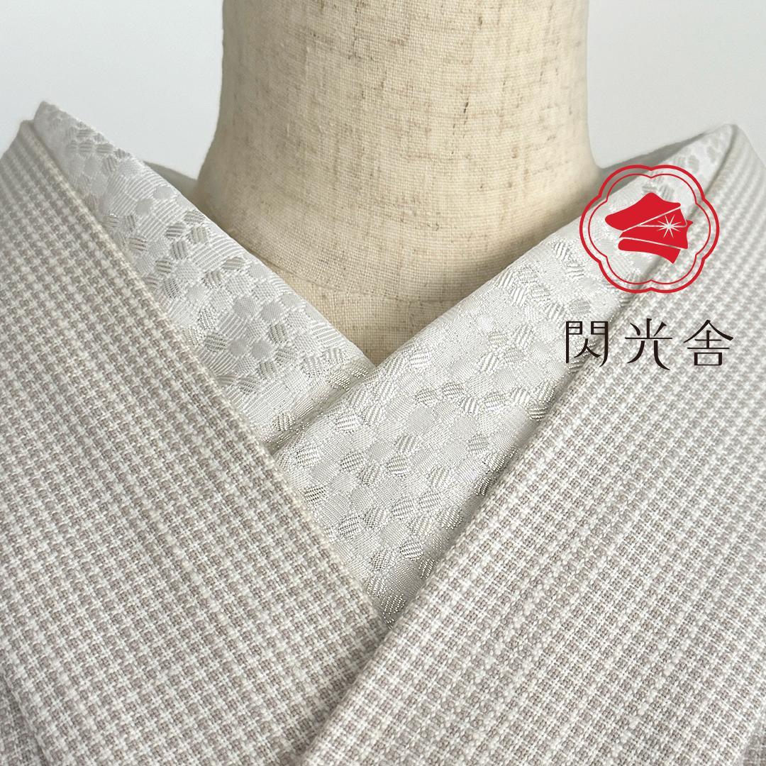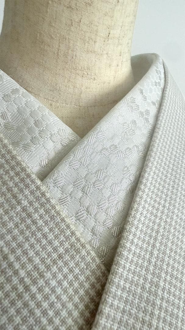 【商品名-2253】 半衿 【ビーハイブ プラチナホワイト】 白銀 ハニカム 紋織り モダン クール ユニセックス リバーシブル 【サイズ・素材】 素材 ポリエステル / ラメ糸(純銀使用) 巾 約 15cm 長さ 約 95cm 【着用シーン】 カジュアル~セミフォーマルな装いに。 紬、小紋、木綿、ウール、デニム、アンティーク着物、 パーティーでの色無地、訪問着、付下げ、振袖、成人式の前撮りなどにも。 【着用時期】 9月~5月 袷の時期に 【お手入れ】 ご自宅でのお手入れが可能です。 やさしく手洗いしてあげてください。 【商品について】 整然と並ぶ「蜂の巣(ハニカム)」模様を、純銀を使った光沢糸で織り上げました。遠目には無地に見えるほどの繊細さでありながら、光の角度で幾何学模様が浮き立つ、奥行きのある表情が魅力です。 「可愛い」モチーフを、クールでハイエンドな質感に落とし込んだ、大人のためのモダンな一枚です。 訪問着や付け下げなどのセミフォーマル〜軽めの礼装(パーティーシーン等)にも、あえてこの「柄のある白」を合わせることで、格式張りすぎない抜け感を作れます。(吉祥柄の亀甲柄ですしね!) もちろん、紬や小紋に合わせて、モードな輝きをプラスするのもおすすめです。 裏面は織りの組織が反転し、また異なるマットな表情を見せます。 その日の着物や帯の質感に合わせて使い分けられる、実用的な2way仕様です。 全4色、他のお色もぜひご覧ください。 ※正確なお色を画像でお伝えするのが難しいです。 厳密な色合いを求める方はご遠慮ください。 ※着用のイメージとして、一部AIによる生成画像を掲載しています。 お買い物のヒントにどうぞ。