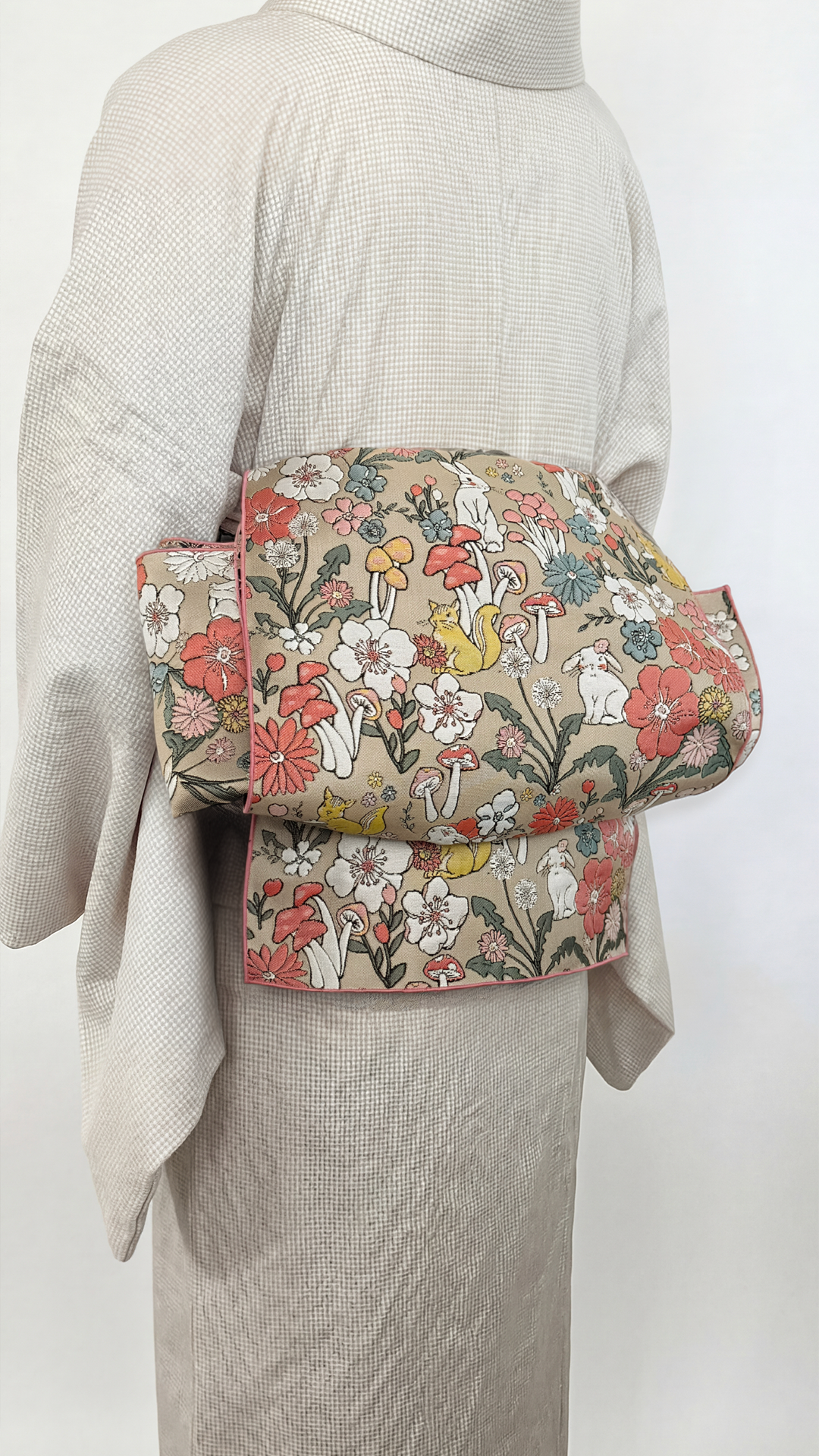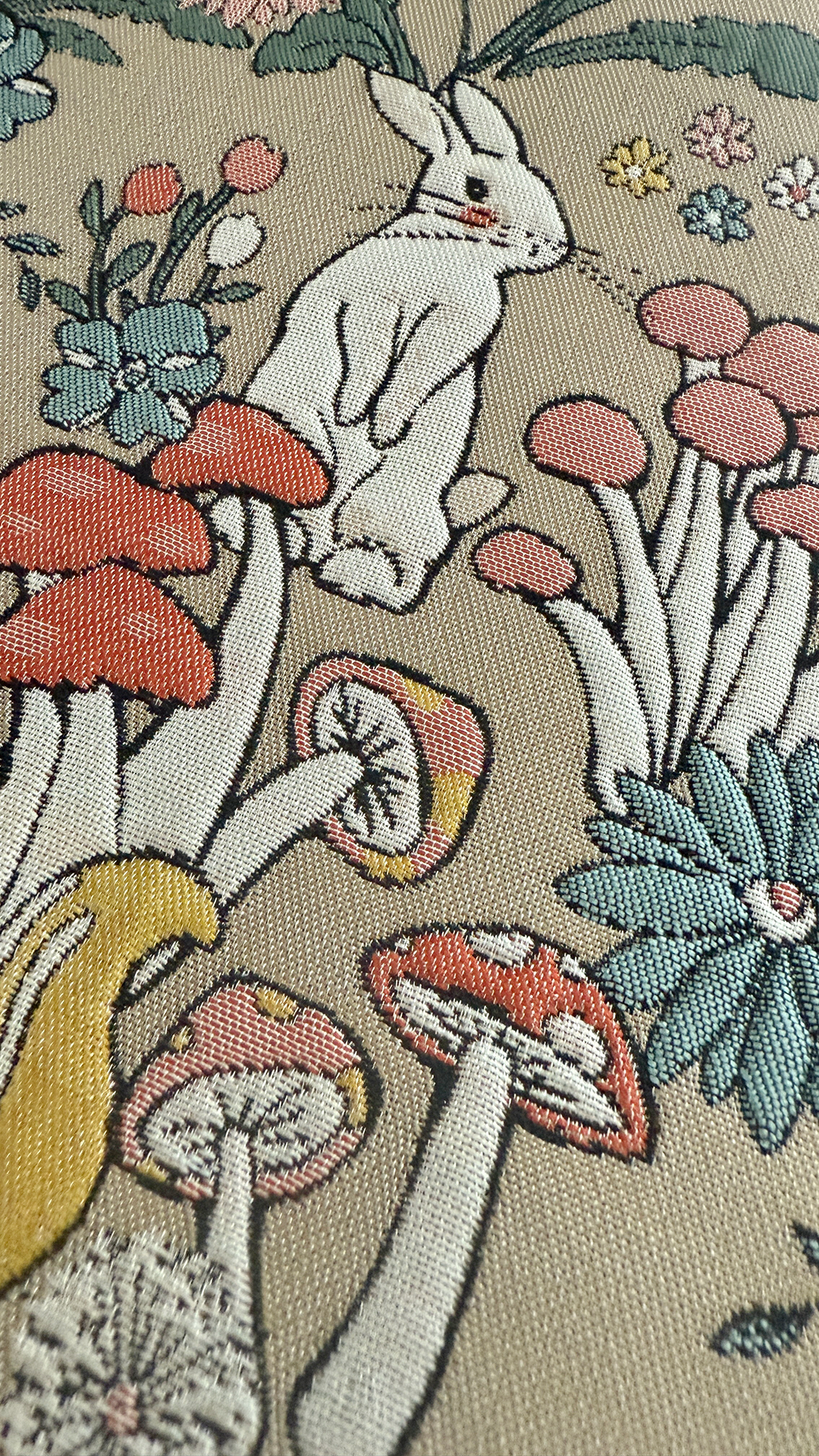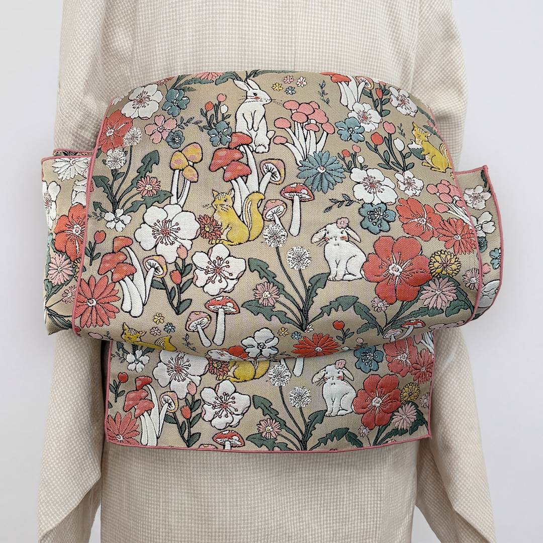 まるで絵本の中から飛び出してきたような、愛らしいウサギとリス、カラフルな花やきのこたちが織りなす、メルヘンチックな柄行の兵児帯です。