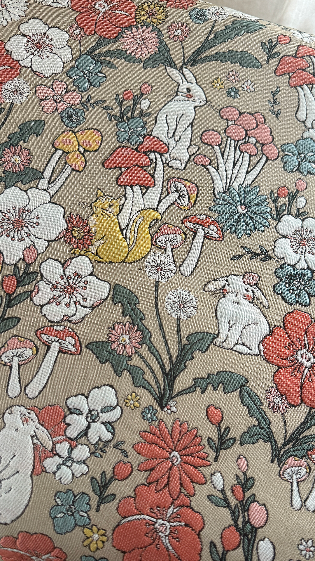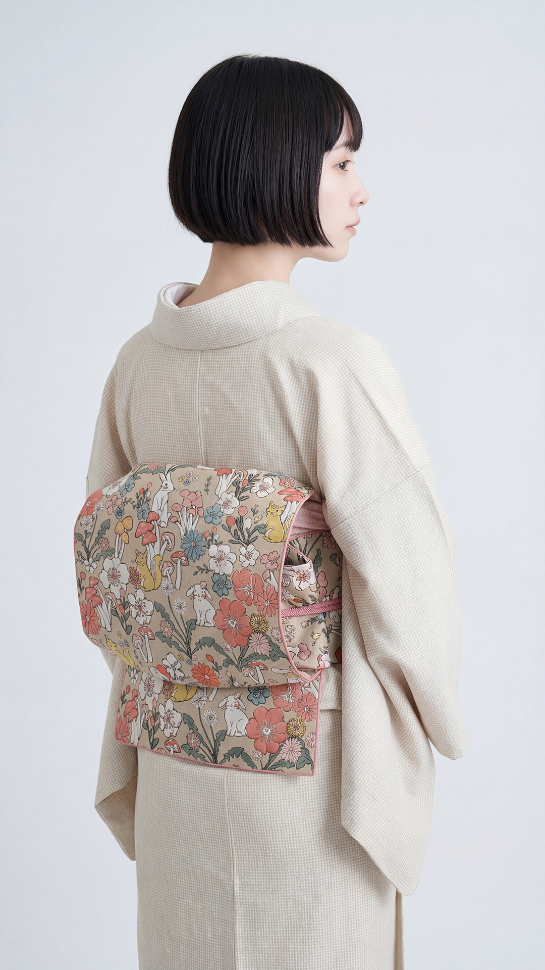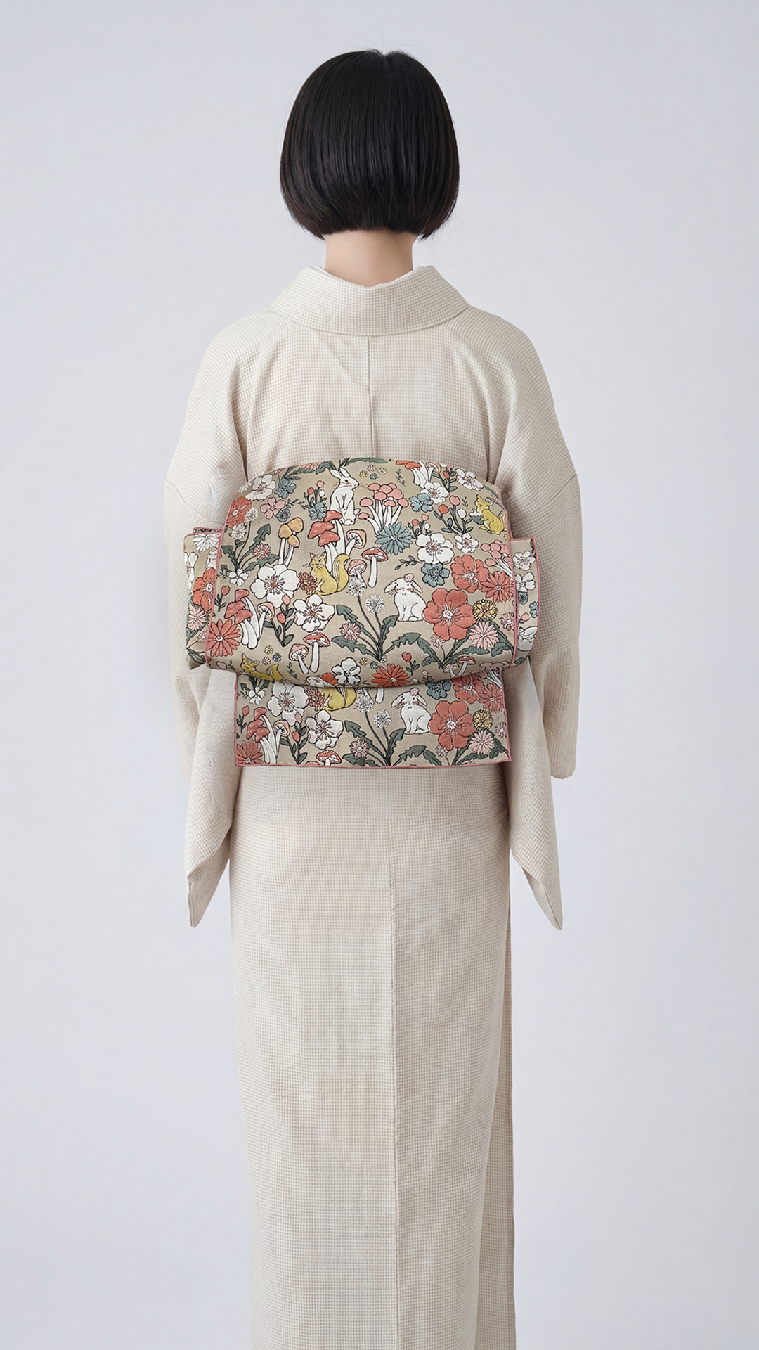 まるで絵本の中から飛び出してきたような、愛らしいウサギとリス、カラフルな花やきのこたちが織りなす、メルヘンチックな柄行の兵児帯です。