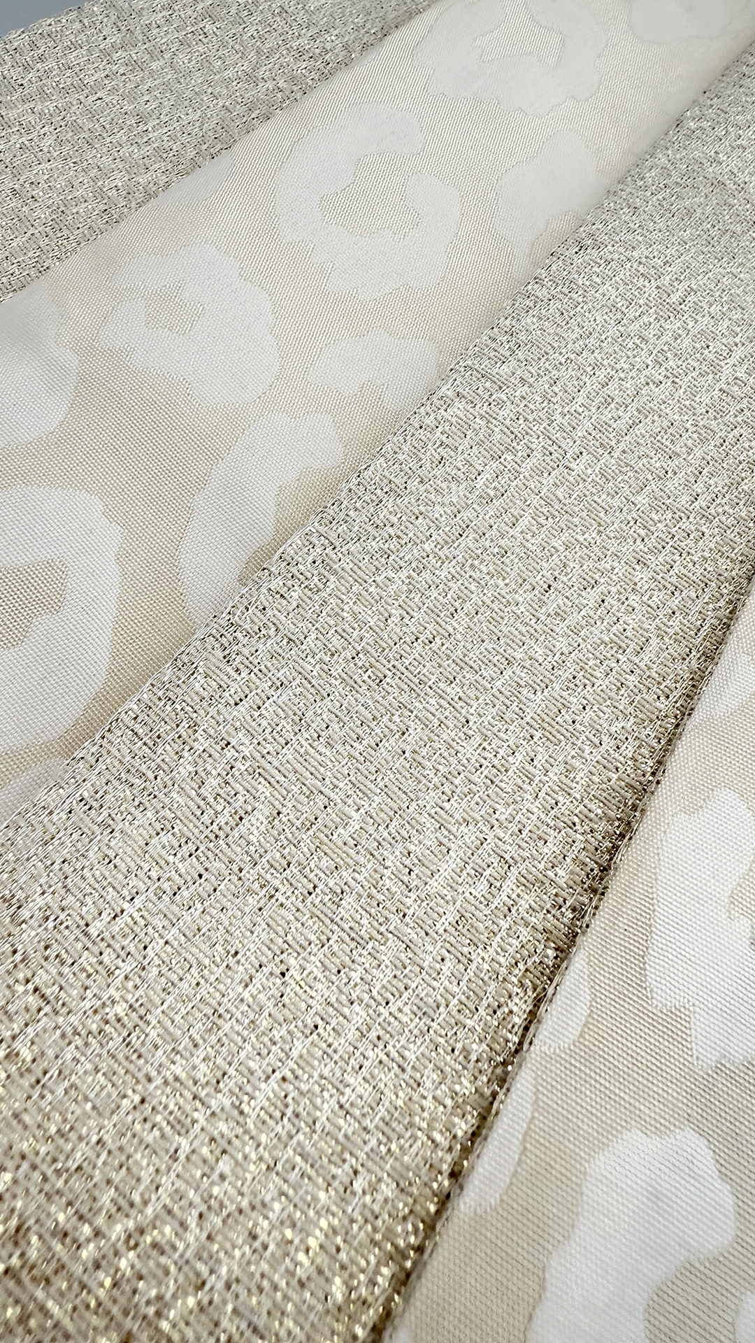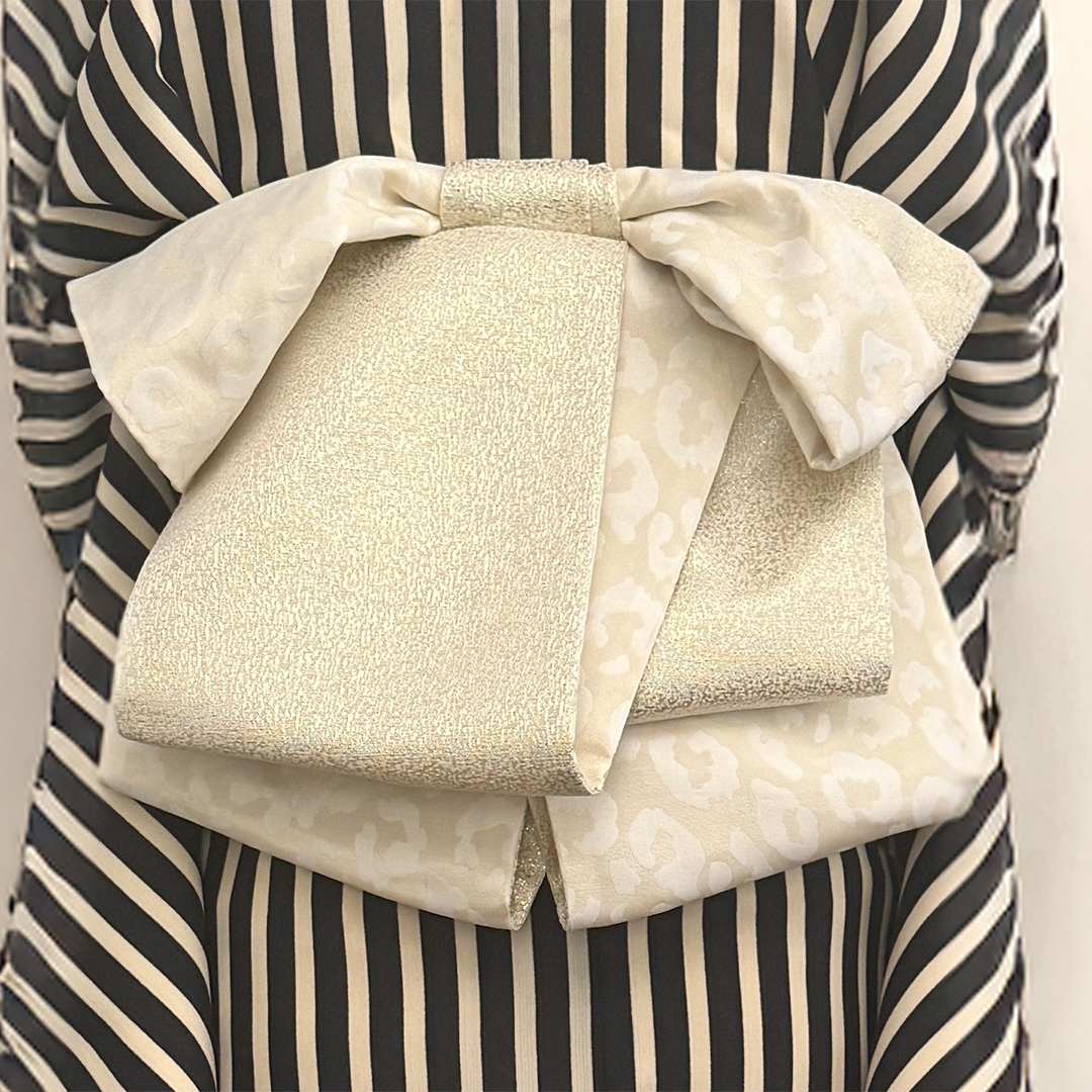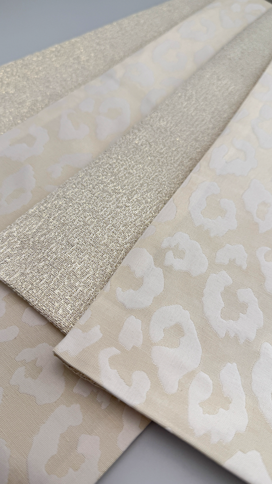 ミルク色のヒョウ柄とミルキーなグリッター(ラメ)、二つの顔を持つリバーシブル仕様の帯です。